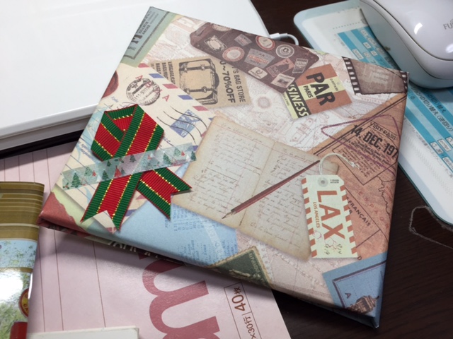 うちにちょうどいい包装紙があって、我ながらうまい具合にラッピングできたので、持っていく前に自宅でパシャッと。